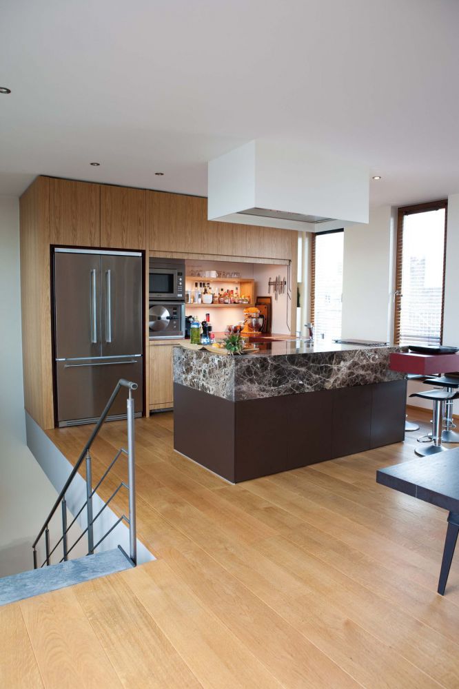 De massieve eiken parketvloer in boekvorm* met zijn goudblonde kleur komt hier prachtig tot zijn recht en benadrukt het beoogde natuurlijke en serene karakter van deze loft.