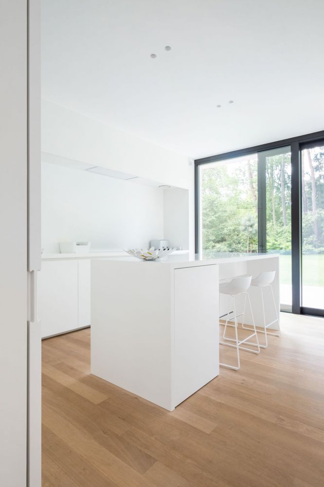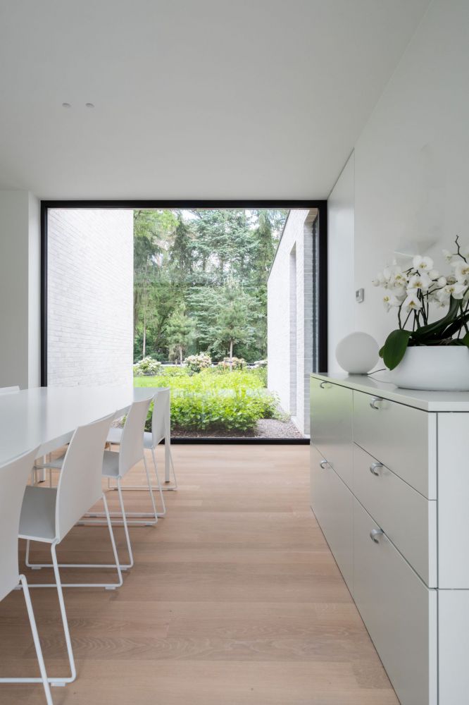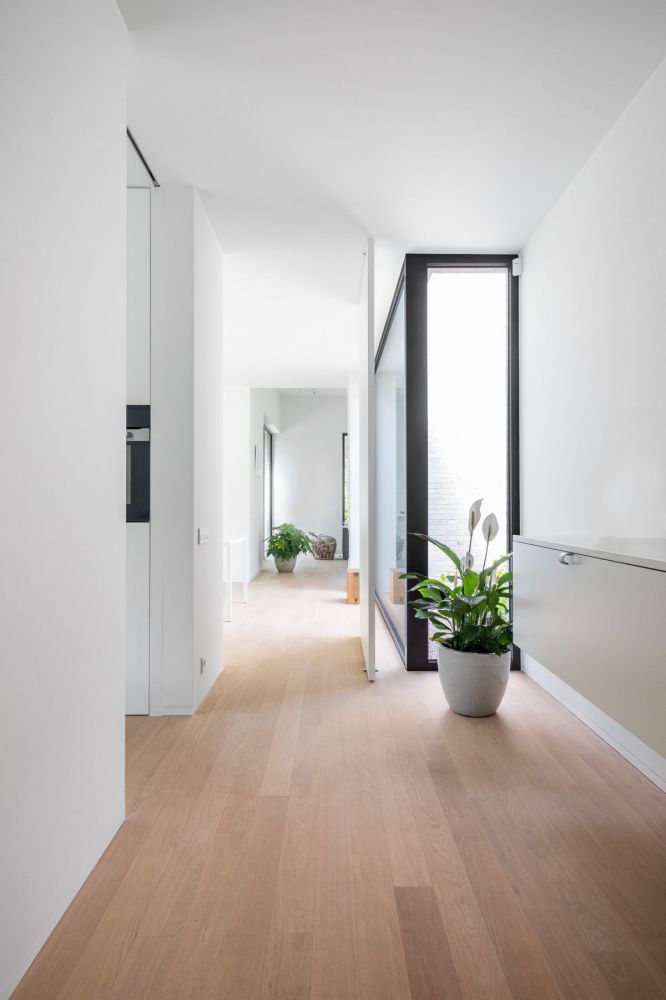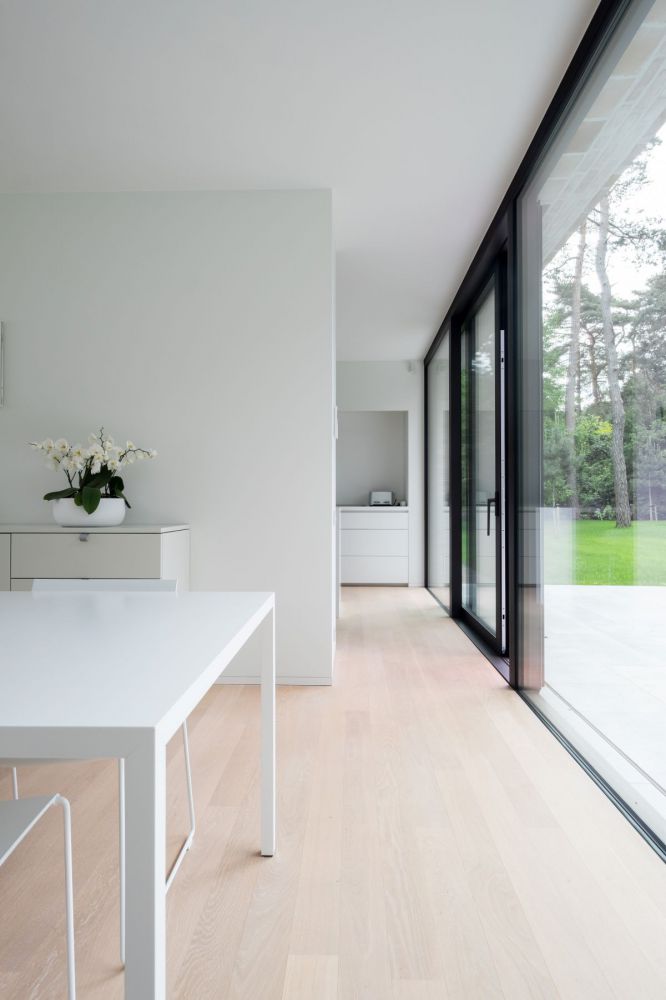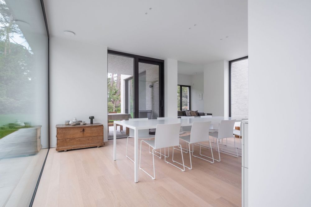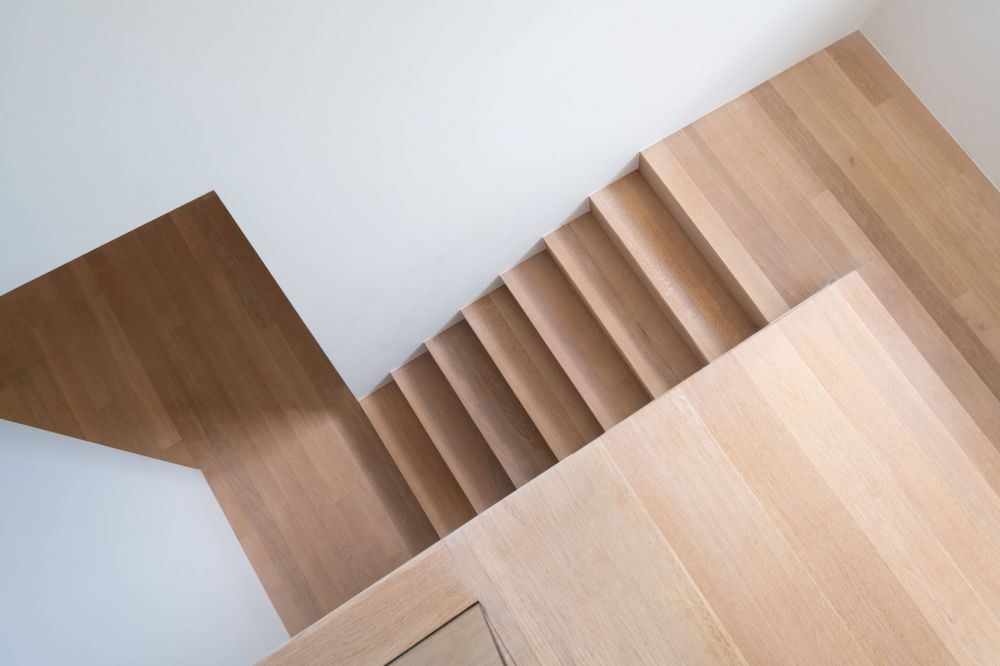 De vloer werd ter plaatse behandeld met een wit getinte parketolie die voor een extra eigentijdse uitstraling zorgt. De lichte uitstraling komt ook het ruimtelijk gevoel ten goede, net als het feit dat de vloer over het volledige gelijkvloers doorloopt en de ruimtes visueel verbindt.