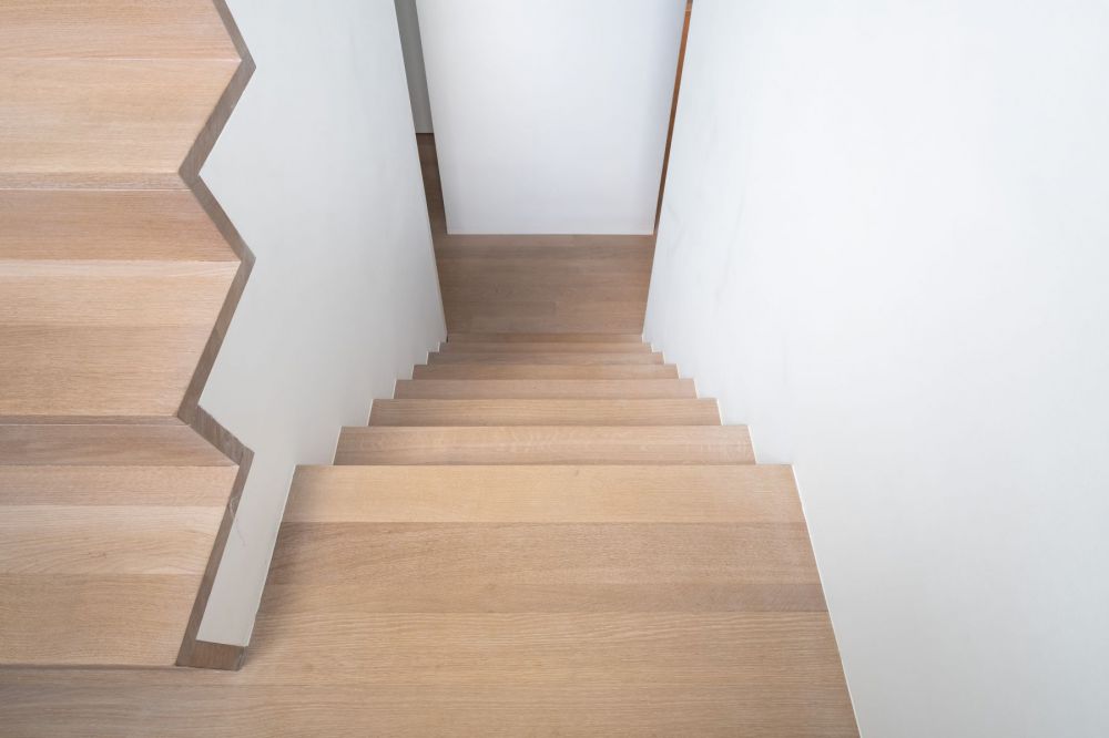 Meer nog, ook de trap met Z-treden, een minutieus millimeterwerk, werd door ons met dezelfde Franse eik bekleed.