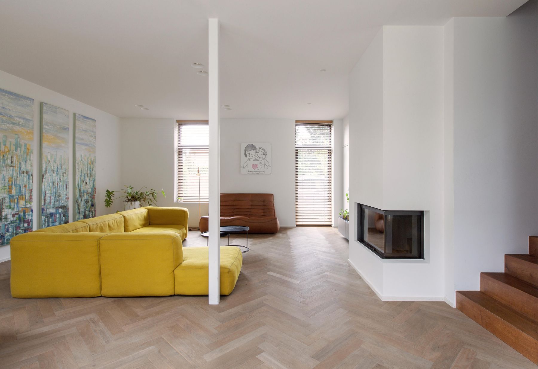 Een oude hoeve herleeft met een strak interieur en een karaktervol eiken visgraatparket.