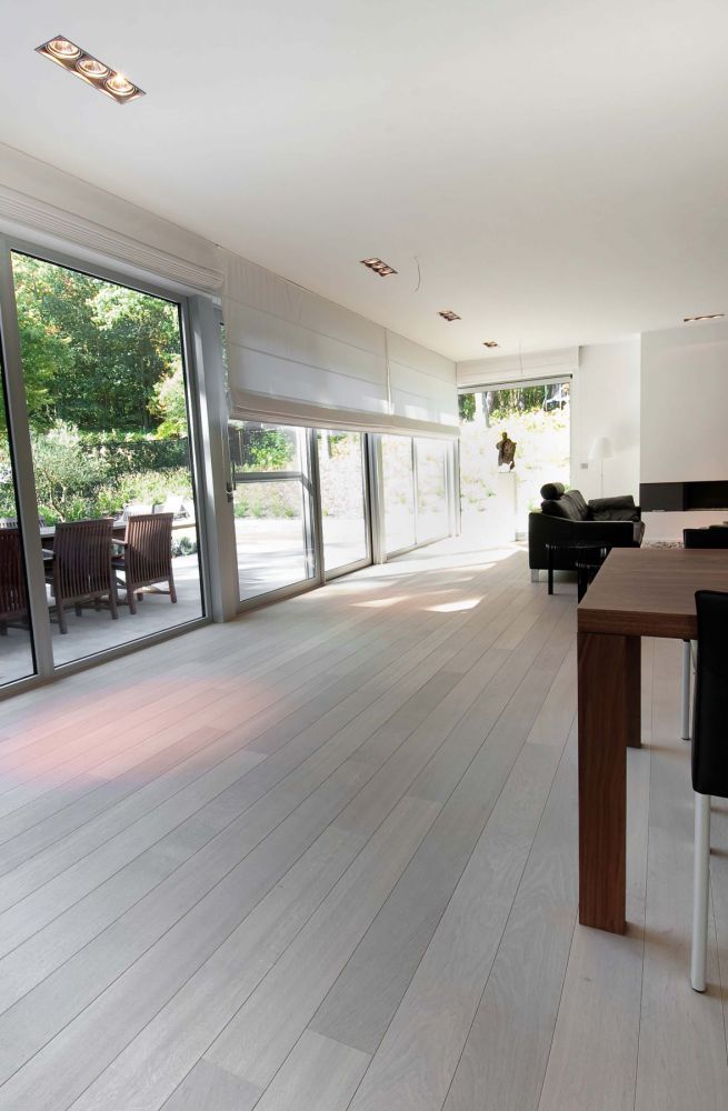 In deze moderne woning koos men voor een parketvloer in eik premier (1e keus) in vaste breedte14 cm. De witte olie benadrukt nog meer het neutrale en strakke karakter.