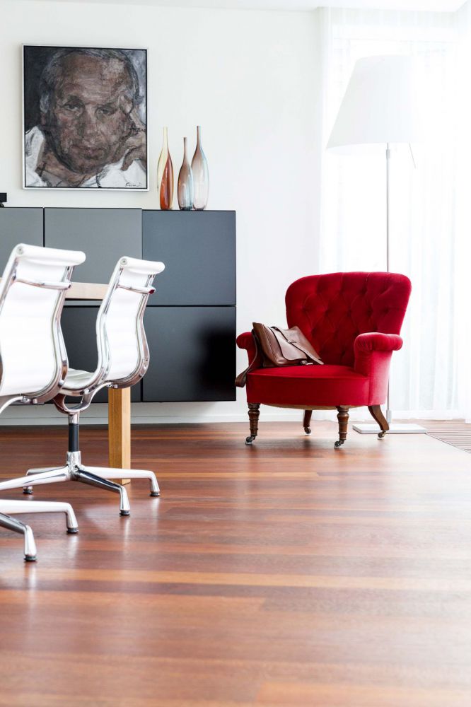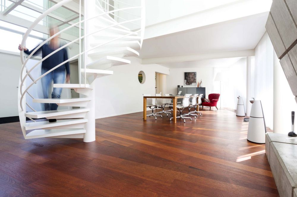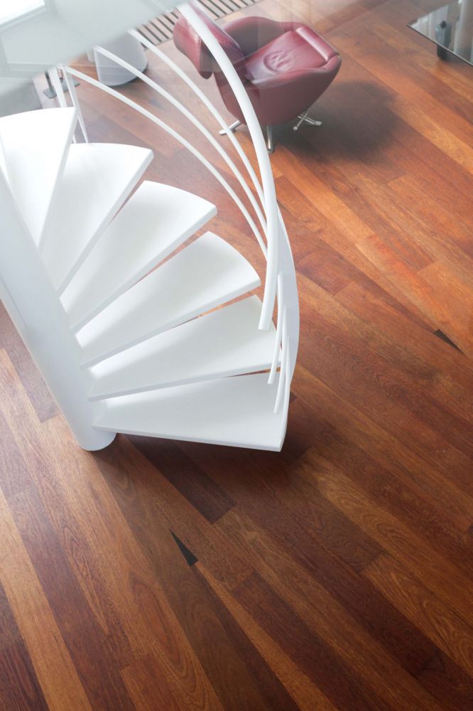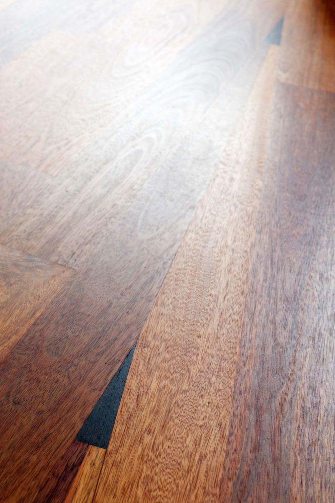 Het parket werd waaiervormig geplaatst, de houtrichting haaks op de ramen.